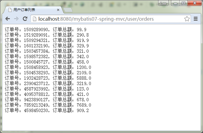 在浏览器中打开网址:http://localhost:8080/mybatis07-spring-mvc/user/orders,输出结果如下图所示: