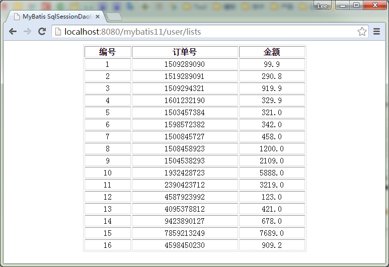 下一步,我们运行检验结果(根据用户id,读取这个用户的所有订单),打开浏览器,输入网址:http://localhost:8080/mybatis11/user/lists ,结果如下图所示: