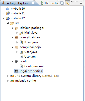 首页我们创建一个 java 工程叫作:mybatis12,内容与之前 mybatis+spring 差不多,实现一个通过指定用户id并读取其订单列表,来观察sql的执行情况。其工程目录结构如下:
