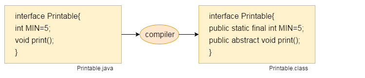 java编译器在接口方法之前添加public和abstract关键字。还有,它在数据成员之前添加public,static和final关键字。