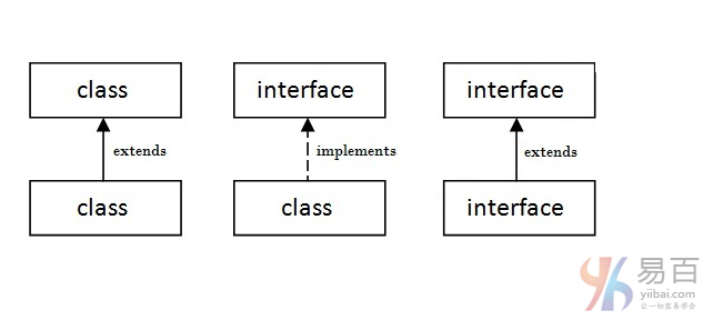 如下图所示,一个类扩展了另一个类,一个接口扩展了另一个接口,一个类实现了一个接口。