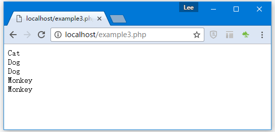 现在我们将打印 $name,${$name},$cat,${${$name}}和$dog的值。
