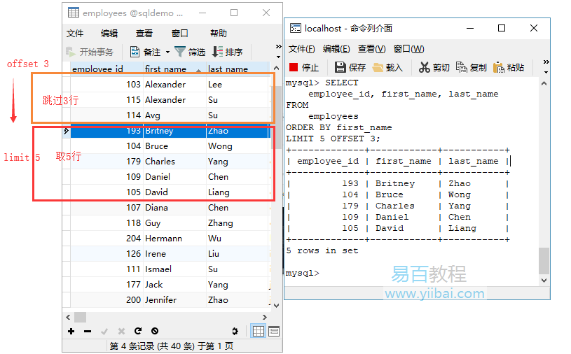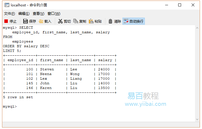 首先,order by子句按工资按降序对员工进行排序,然后limit子句限制从查询返回的五行。