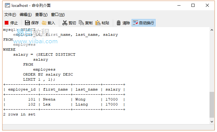 order by子句按工资降序对员工进行排序。 limit 1 offset 1子句从结果集中获取第二行。
