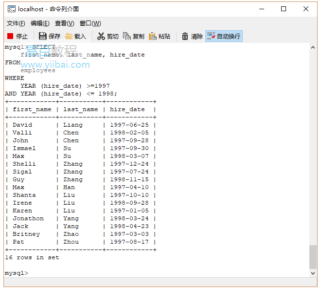 要查找1997年到1998年之间加入公司的所有员工,使用and运算符,如下所示: