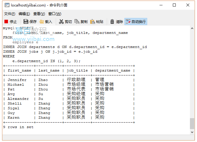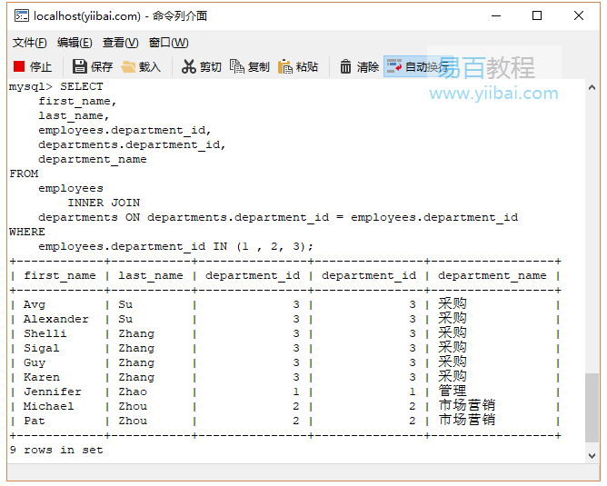 如果满足条件employees.department_id = departments.department_id,则employees和departments表中行的数据的组合行将包含在结果集中。