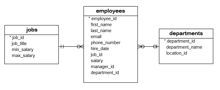 以下数据库图说明了employees, departments 和 jobs 表之间的关系: