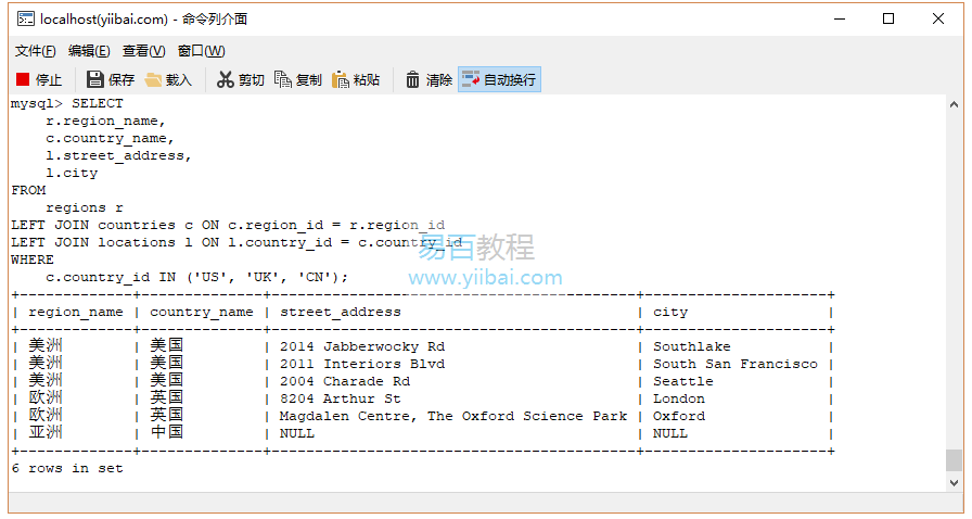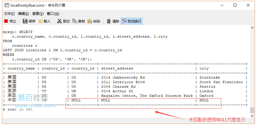 如果没有找到匹配的行,例如,使用country_id的值是:cn,则countries表中的行包含在结果集中,而locations表中的行用null值填充。