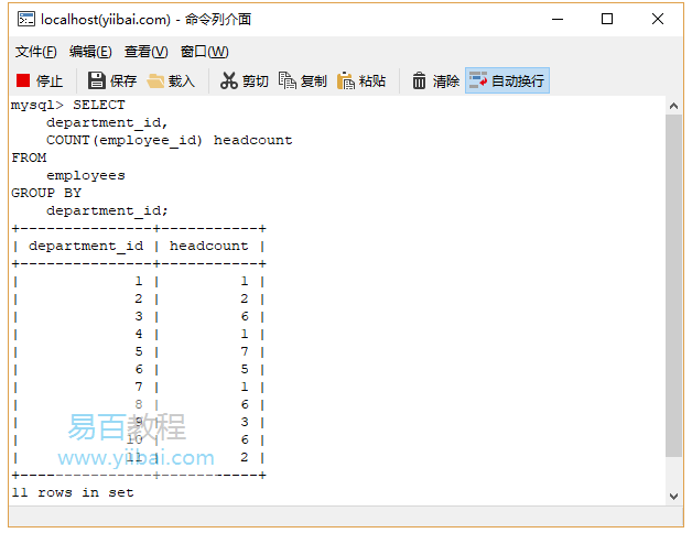要查找每个部门的员工数量,请按department_id列对员工进行分组,并将count函数应用于每个组,如下所示: