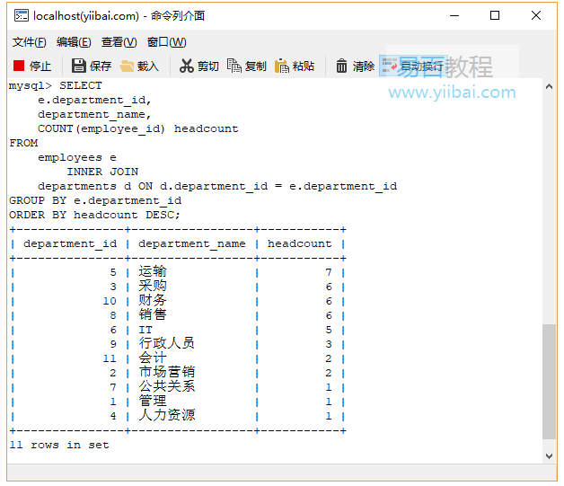 注意,可以在order by子句中使用headcount别名或count(employee_id)。