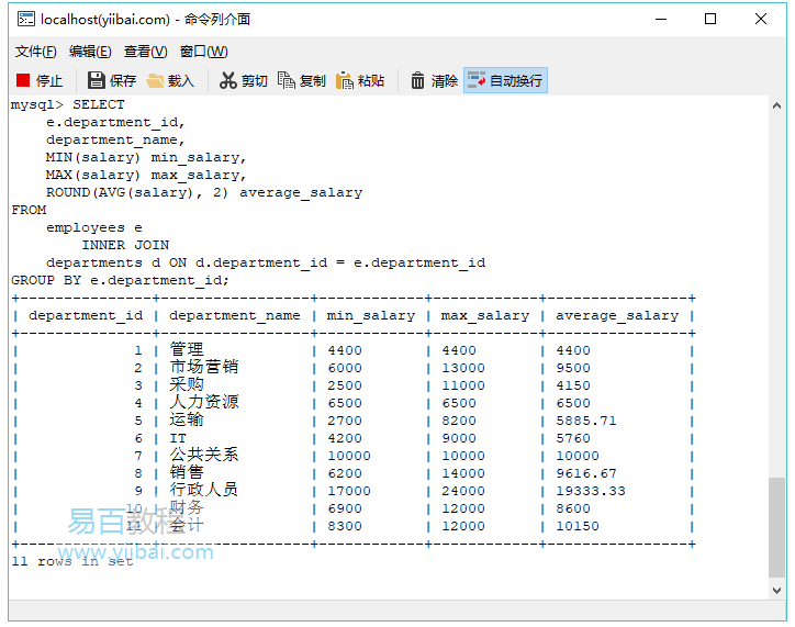 以下查询返回每个部门中员工的最低,最高和平均工资。