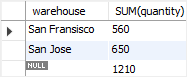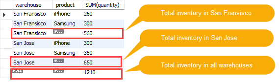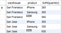 正如在结果中看到的那样,warehouse列中的null值指定了总计超级聚合行。 在此示例中,rollup选项使查询生成另一行,显示所有仓库中的总产品数量。