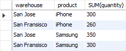 在此示例中,rollup仅为product列而不是warehouse列生成超级聚合摘要。