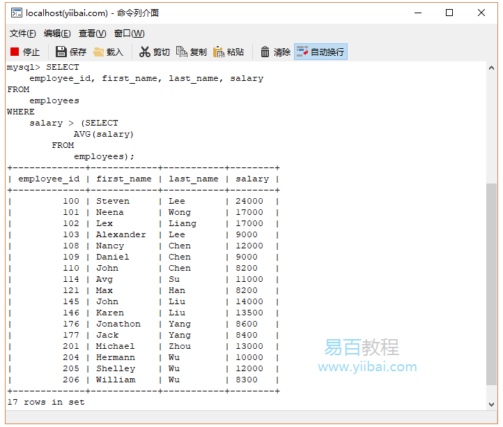 在此示例中,首先,子查询返回所有员工的平均工资。 然后,外部查询使用大于运算符来查找工资大于平均值的所有员工。