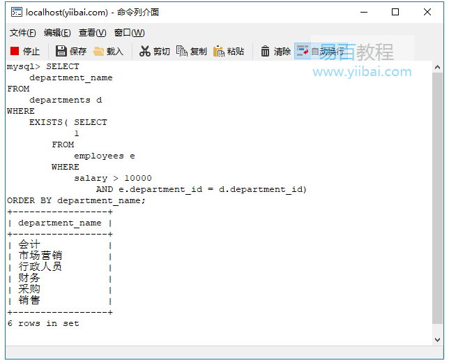 以下示例查找至少有一名员工的薪水大于10000的所有部门:
