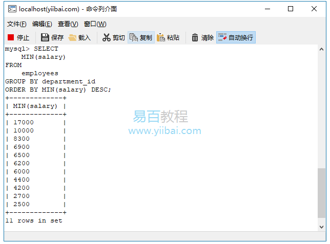 以下查询使用group by子句和min()函数按部门查找最低工资:
