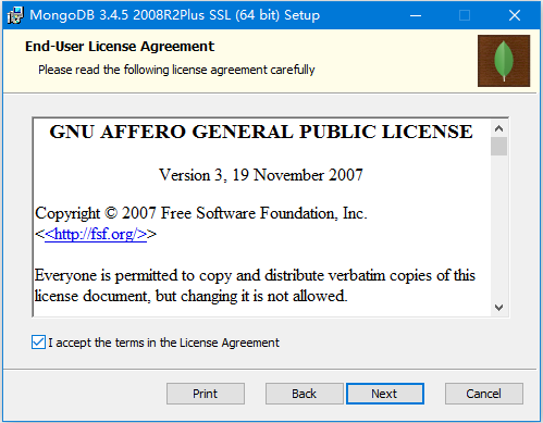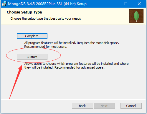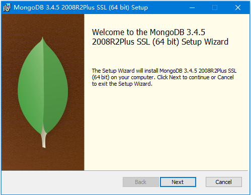 在windows资源管理器中,找到下载的mongodb.msi文件,通常位于默认的“下载”文件夹中。 双击mongodb-win32-x86_64-2008plus-ssl-3.4.5-signed.msi文件。 将出现一组屏幕,指导您完成安装过程。