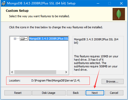 下一步(next>),选择安装目录为:d:\program files\mongodb\server\3.4\ ,如下图所示 -