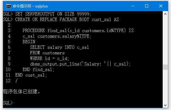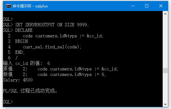 当上述代码在sql提示符下执行时,它会提示输入客户id,当输入一个id时,显示相应的工资如下 -