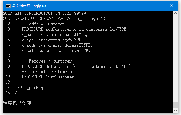 当上面的代码在sql提示符下执行时,它会创建上面的包并显示以下结果 -
