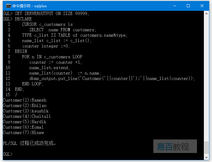 dbms_output.put_line('customer('||counter||'):'||name_list(counter));