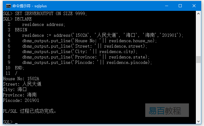 对象是使用create [or replace] type语句创建的。 以下是创建一个由几个属性组成的简单地址(address)对象的例子 -