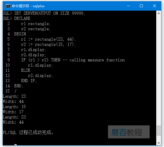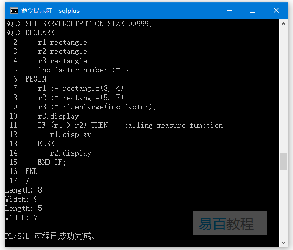 以下程序演示了pl/sql对象中的继承。首先创建另一个名为tabletop对象,它是从rectangle对象继承的。因此,需要创建这个基础的rectangle对象,参考以下代码 -