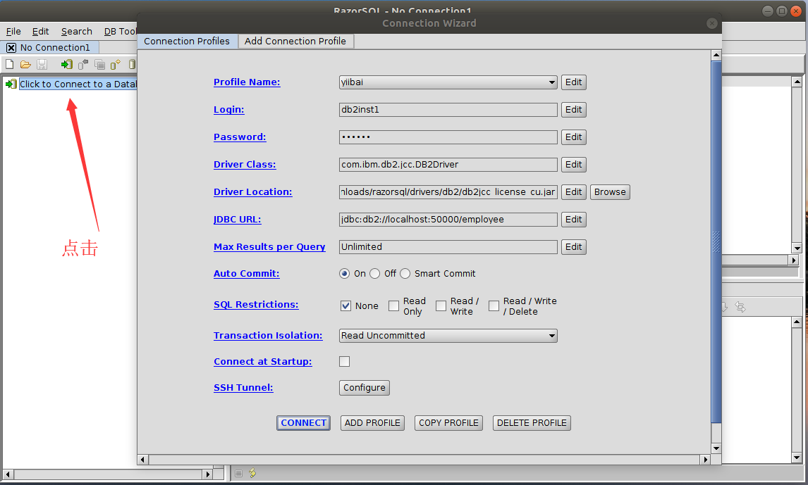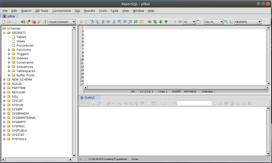 在命令行中使用db2有点复杂,不过可以通过下载razorsql来使用图形用户界面。
