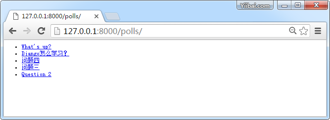 该代码加载模板调用polls/index.html,然后传递给它的上下文。上下文是一个字典以python对象映射模板变量名。现在访问url(http://127.0.0.1:8000/polls/)查看结果 :