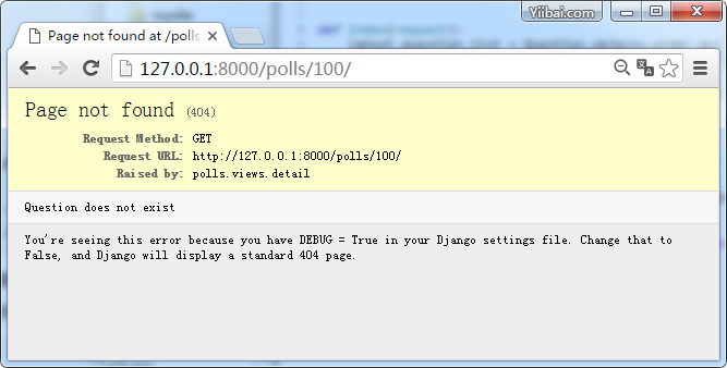 引发 404 错误,现在我们请求一个不存在问题,如:http://127.0.0.1:8000/polls/100/,显示结果如下: