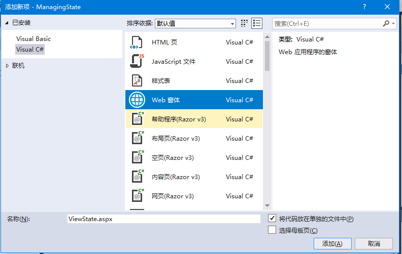 添加一个新的窗体页面 - viewstate.aspx,如下所示 -
