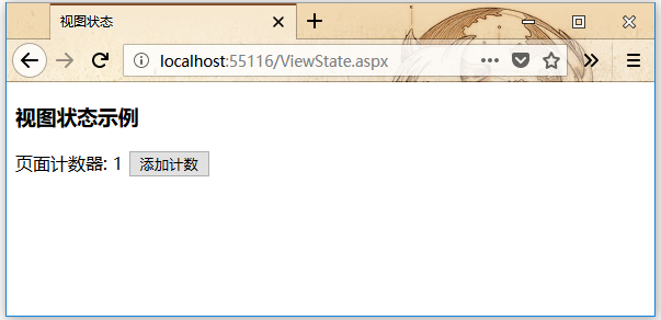 以下示例演示了存储视图状态的概念。使用一个计数器,通过单击页面上的按钮,每次页面被重新发送时,计数器都会增加。 另一个标签控件显示计数器中的值。