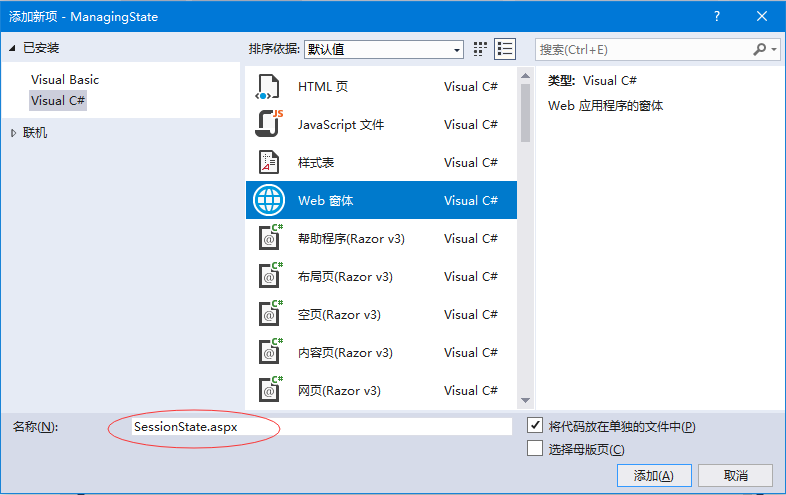 在项目:managingstate 上创建一个新的窗体文件:sessionstate.aspx ,如下所示 -