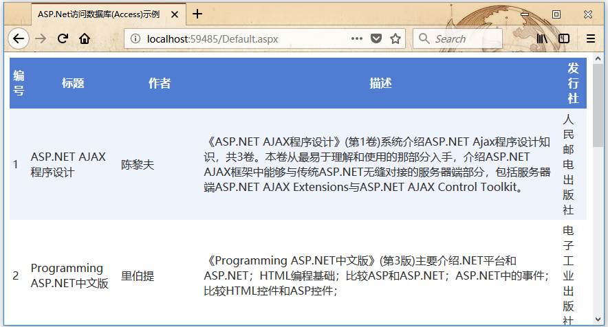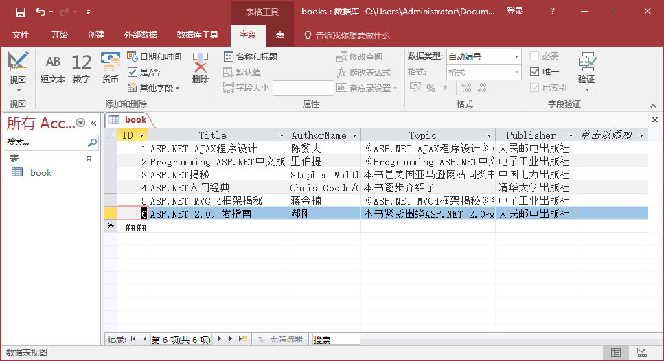 在这示例中,使用access数据库,表中包含有关.net图书的详细信息。数据库的名字是aspdotnetstepbystep.mdb,并使用数据表:dotnetreferences用来存储图书的信息。