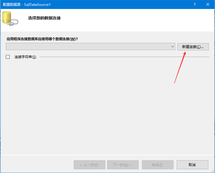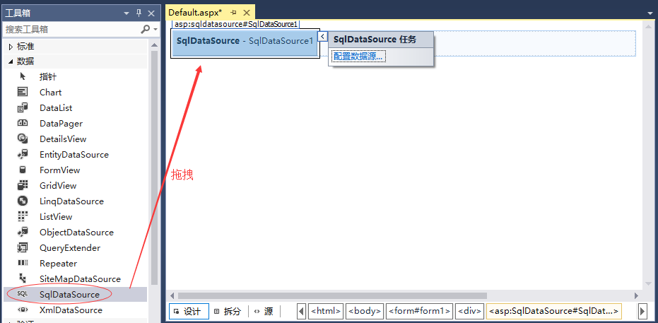 接下来,在web窗体(default.aspx)上添加一个sqldatasourcecontrol。
