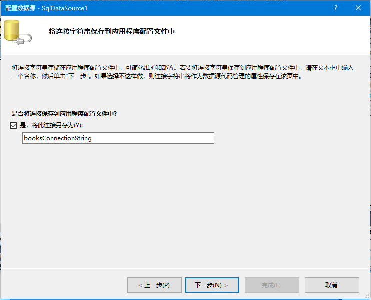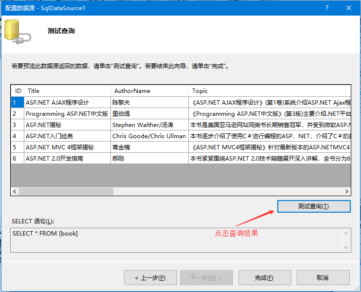 <asp:sqldatasource id="sqldatasource1" runat="server" connectionstring="<%$ connectionstrings:booksconnectionstring %>" providername="<%$ connectionstrings:booksconnectionstring.providername %>" selectcommand="select * from [book]"></asp:sqldatasource>