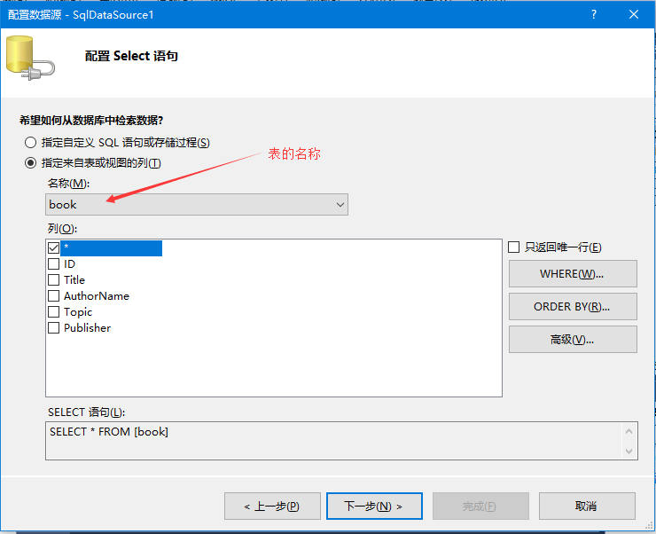 第5步: 选择列并点击下一步完成步骤。 观察where,order by和高级按钮。 这些按钮可用来提供where子句,order by子句,并分别指定sql的插入,更新和删除命令。 这样就可以操纵数据。