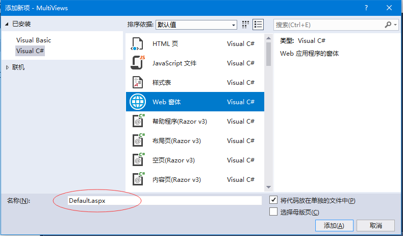 在这个项目名称上点击右键,在弹出的选项中选择:添加 -> 添加新项,选择web窗体,创建一个文件:default.aspx, 如下所示 -