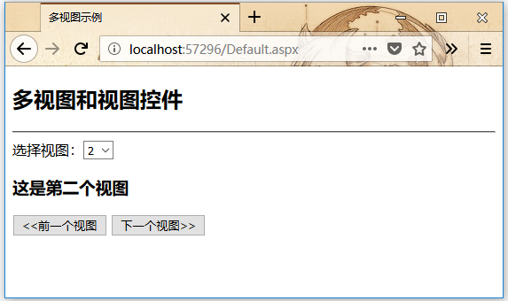 multiview.activeviewindex确定将显示哪个视图。这是在页面上呈现的唯一视图。 当没有显示视图时,activeviewindex的默认值是-1。由于activeviewindex在本例中定义为2,所以在执行时会显示第三个视图。