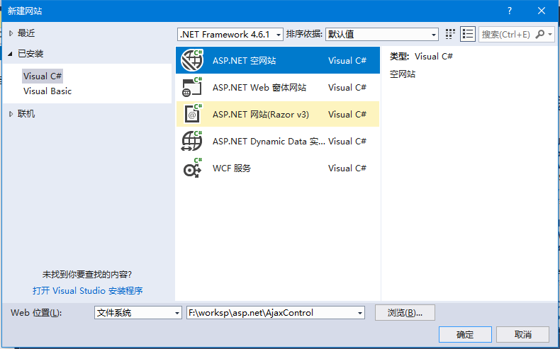 首先打开visual studio,创建一个名称为:ajaxcontrol 的空asp.net网站项目,如下所示 -