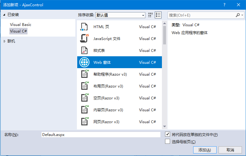 在这个项目名称上点击右键,在弹出的选项中选择:添加 -> 添加新项,选择web窗体,创建一个文件:default.aspx, 如下所示 -