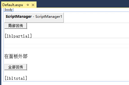 在应用程序中添加一个ajax web表单。 它包含默认的脚本管理器(scriptmanager)控件,插入更新面板。 在更新面板控件内放置一个按钮控件和一个标签控件。 在面板外面放置另一组按钮和标签。