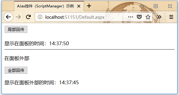 请注意,执行该页面时,如果点击全部回传按钮,则会更新两个标签中的时间,但如果单击局部回传按钮,则只会更新更新面板中的标签。
