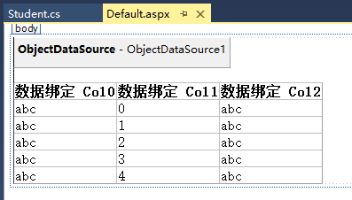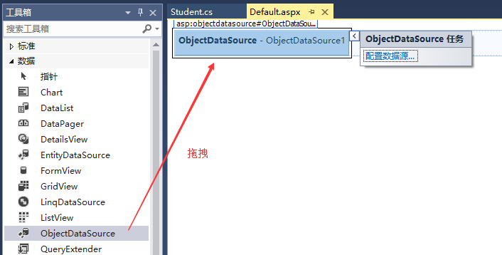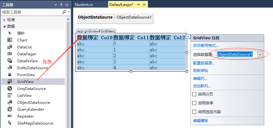 students.cs),并将上面的代码放入其中。objectdatasource控件放置在web窗体中。如下图所示 -gridview),并选择对象数据源作为其基础数据源。文件 default.aspx 中的代码如下所示 -