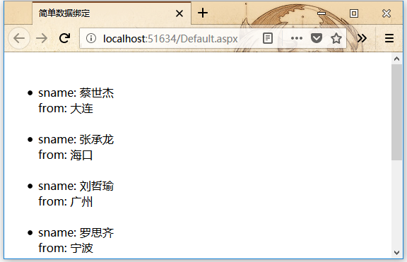 执行应用程序时,请检查整个sname和from列是否绑定到项目符号列表并显示。