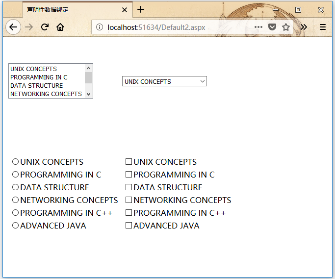 第2步: 在页面上添加四个列表控件,一个列表框控件,一个单选按钮列表,一个复选框列表,一个下拉列表和四个标签以及这些列表控件。设计视图中的页面应该如下所示: