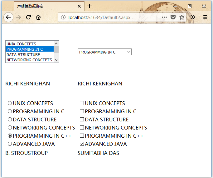 booklist类有两个属性:bookname和authorname。createbooklist方法是用户定义的方法,它创建一个名为allbooks包含booklist对象数组。page_load事件处理程序确保创建booklist。该列表是ilist类型,它实现了ienumerable接口,并且能够绑定到list控件。页面加载事件处理程序将ilist对象“bklist”与list控件的绑定。bookname属性将被显示,并且authorname属性被视为值。list控件显示,而相应的标签显示作者姓名,该名称是list控件的所选索引的对应值。运行上面项目,得到以下结果 -