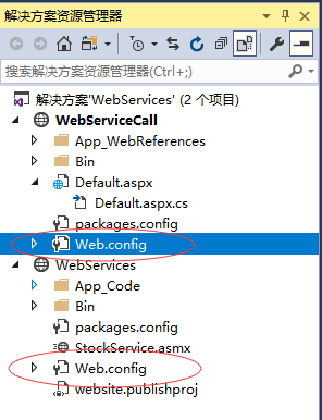 在这个应用程序中,有两个web.config文件用于两个项目,即web服务和调用web服务的web站点。