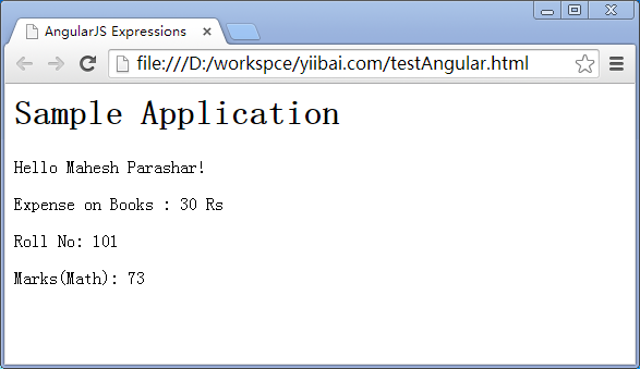 testangularjs.html 文件代码如下:<html> <title>angularjs expressions</title> <body> <h1>sample application</h1> <div ng-app="" ng-init="quantity=1;cost=30; student={firstname:'mahesh',lastname:'parashar',rollno:101};marks=[80,90,75,73,60]"> <p>hello {{student.firstname + " " + student.lastname}}!</p> <p>expense on books : {{cost * quantity}} rs</p> <p>roll no: {{student.rollno}}</p> <p>marks(math): {{marks[3]}}</p> </div> <script src="http://ajax.googleapis.com/ajax/libs/angularjs/1.2.15/angular.min.js"></script> </body> </html>