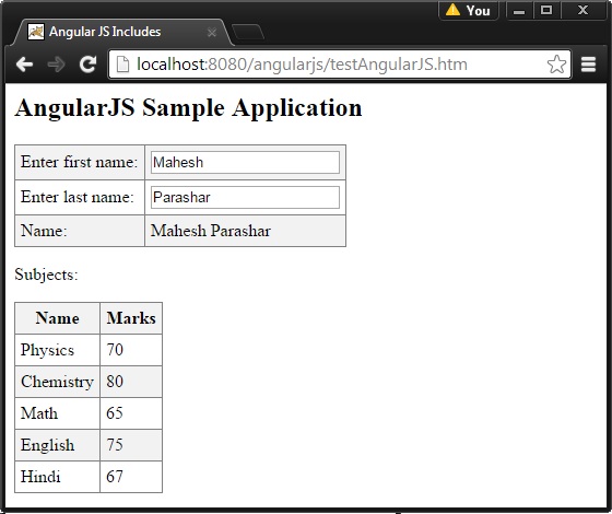 <html> <head> <title>angular js includes</title> <style> table, th , td { border: 1px solid grey; border-collapse: collapse; padding: 5px; } table tr:nth-child(odd) { background-color: #f2f2f2; } table tr:nth-child(even) { background-color: #ffffff; } </style> </head> <body> <h2>angularjs sample application</h2> <div ng-app="" ng-controller="studentcontroller"> <div ng-include="'main.html'"></div> <div ng-include="'subjects.html'"></div> </div> <script> function studentcontroller($scope) { $scope.student = { firstname: "mahesh", lastname: "parashar", fees:500, subjects:[ {name:'physics',marks:70}, {name:'chemistry',marks:80}, {name:'math',marks:65}, {name:'english',marks:75}, {name:'hindi',marks:67} ], fullname: function() { var studentobject; studentobject = $scope.student; return studentobject.firstname + " " + studentobject.lastname; } }; } </script> <script src="http://ajax.googleapis.com/ajax/libs/angularjs/1.2.15/angular.min.js"></script> </body> </html>main.html